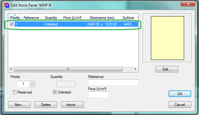 Jeigu MDP 8 mm storio yra daugiau lakštų formatų, vėl spaudžiame „New“ ir įvedame kitą – bus Nr. 2 ir t.t. Galima nurodyti jų kiekį (Quantity) ir suteikti prioritetą – tada to formato lakštai bus naudojami pirmoje eilėje.